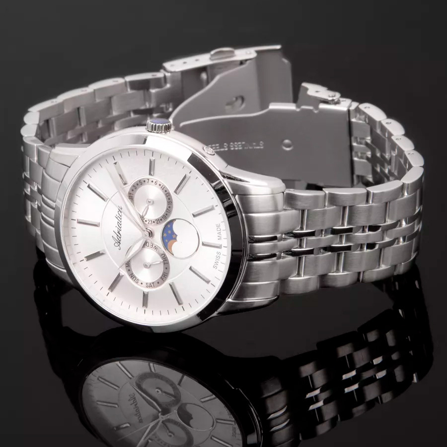 Функции: Центральные часовая, минутная и секундная стрелки. Индикатор фазы Луны. День недели и число отображаются на отдельных циферблатах.