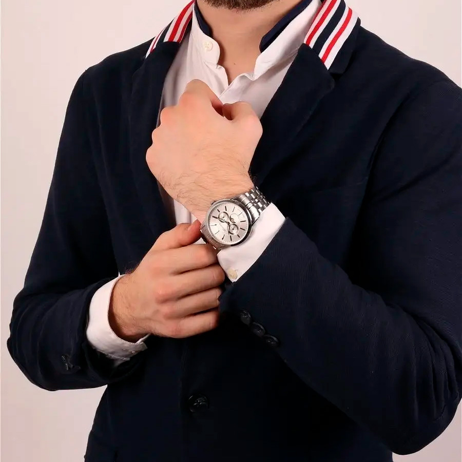 Ремешок: Браслет выполнен из высококачественной стали с повышенной устойчивостью к коррозии, поверхности с матовой шлифовкой – сатинированием и полировкой до зеркального блеска с раскладывающейся застежкой на фиксации.