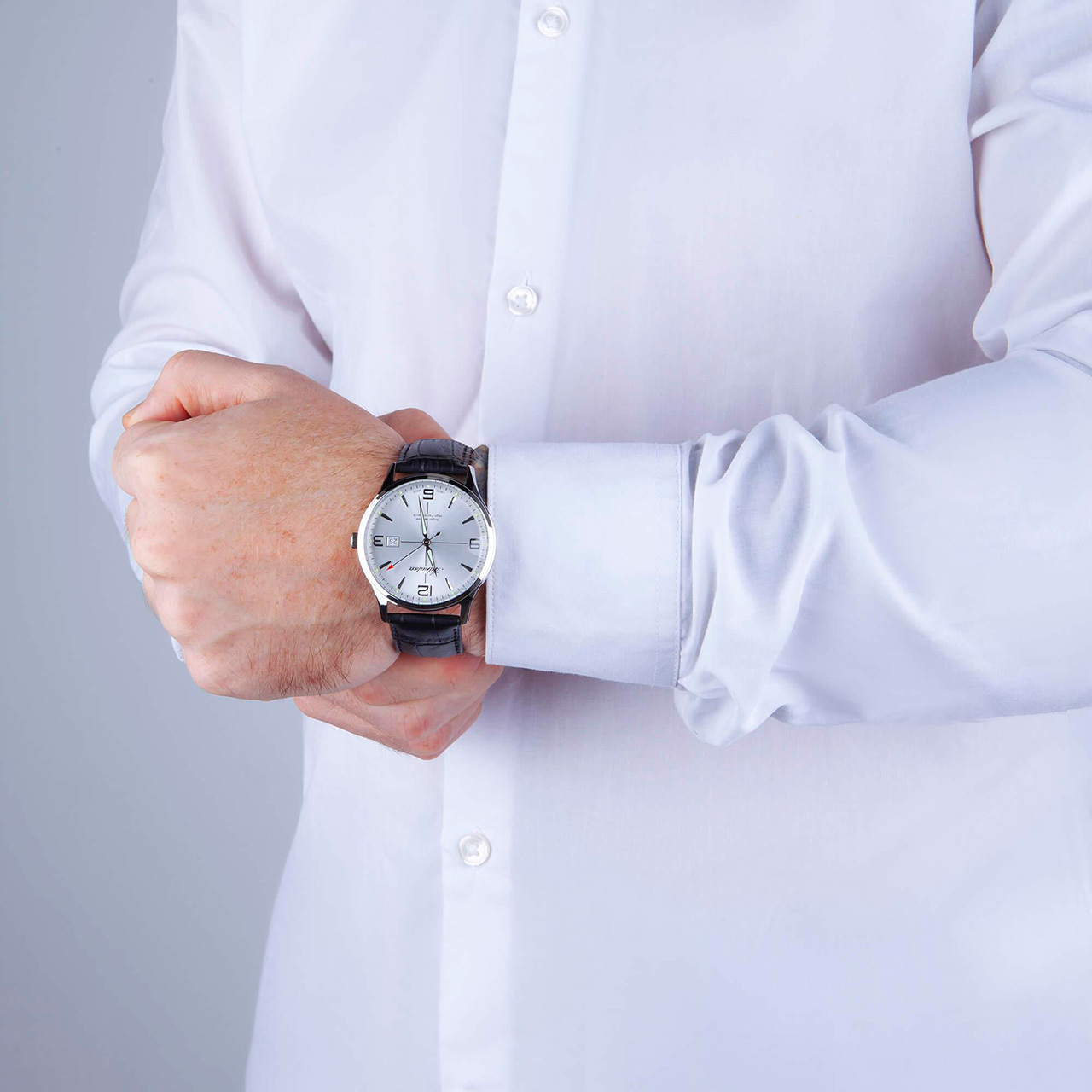 Корпус: Круглый корпус выполнен из полированной нержавеющей стали. Светлый циферблат. Накладные часовые индексы выполнены из стали. Стрелки с покрытием SuperLuminova, которое обеспечивает подсветку в темное время суток. Минеральное стекло. Диаметр корпуса составляет 42 мм, толщина 10 мм. Водостойкость WR 50 (мытье рук, дождь).