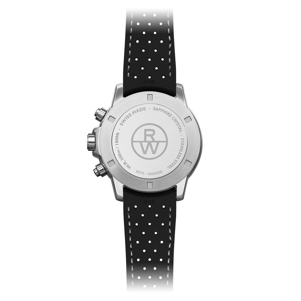 Корпус: Корпус из нержавеющей стали марки 316L. Безель с разметкой тахиметрической шкалы. Черный циферблат с шлифовкой и рельефной поверхностью. Часовые индексы и цифры выполнены методом аппликации, стрелки хронографа с желтым покрытием. Люминесцентное покрытие Super-Luminova на стрелках и часовых индексах. Сапфировое стекло. Переводная коронка украшена логотипом RW. Диаметр 43 мм, толщина 11.9 мм. Водостойкость 300 метров.