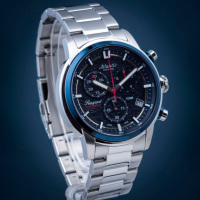 Функции: Центральные часовая и минутная стрелки, маленькая секундная стрелка на «6 часов». Окошко даты. Хронограф с 30-минутным и 1/10-секундным индикаторами на «9» и «3 часах» соответственно. Центральная секундная стрелка хронографа.
