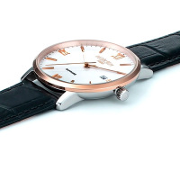 Корпус: Нержавеющая сталь с PVD покрытием цвета розового цвета. Светлый циферблат. Позолоченные стрелки и часовые индексы. Сапфировое стекло с антибликовым покрытием. Водонепроницаемость 50 метров. Диаметр 39 мм.