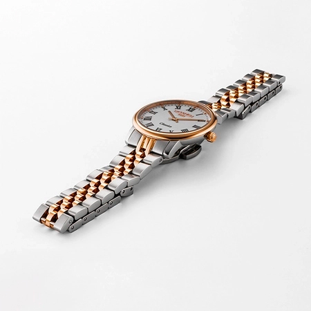 Корпус: Высококачественная нержавеющая сталь, марки 316L с частичным IP покрытием из розового золота. Белый циферблат. Позолоченные стрелки и чёрные римские цифры. Сапфировое стекло с антибликовым покрытием. Рифлёная заводная головка с логотипом марки «Roamer». Диаметр: 30 мм. Водонепроницаемость: 30 м.