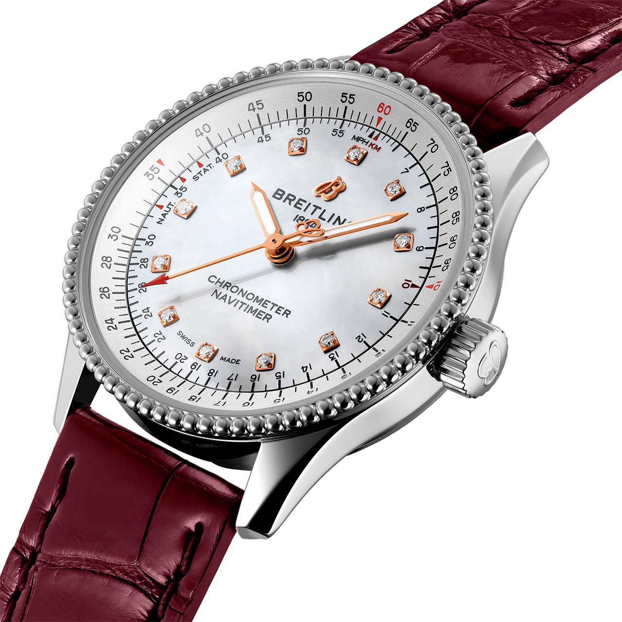 Корпус: Корпус выполнен из высококачественной стали с повышенной устойчивостью к коррозии, поверхности с матовой шлифовкой – сатинированием и полировкой до зеркального блеска. Циферблат в стиле “пилот” из натурального перламутра. Аппликация часовых индексов и стрелки с покрытием и финишной обработкой. Инкрустация 12 бриллиантов в качестве часовых индексов. Выгнутое сапфировое стекло с антибликовым покрытием нанесенным с обеих сторон. Задняя крышка имеет резьбовое соединение с корпусом. Диаметр корпуса составляет: 35 мм. Водозащита: 30 м.