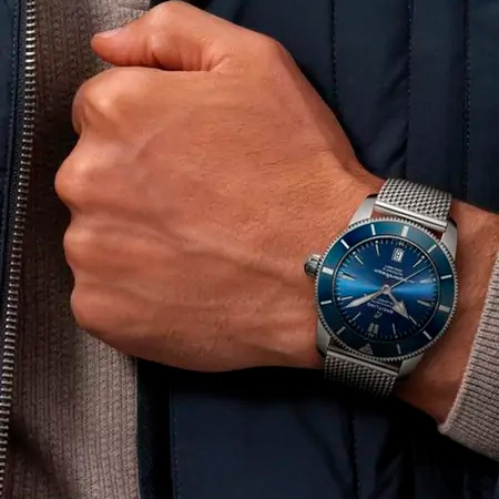 Корпус: Корпус из полированной стали, синий зубчатый вращающийся безель с индексами. Синий циферблат, ретро логотип бренда, стрелки с крупными люминесцентными вставками, полированные минутные индексы. Выпуклое сапфировое стекло с двусторонним антибликовым покрытием. Диаметр 46 мм. Водонепроницаемость 200 м.