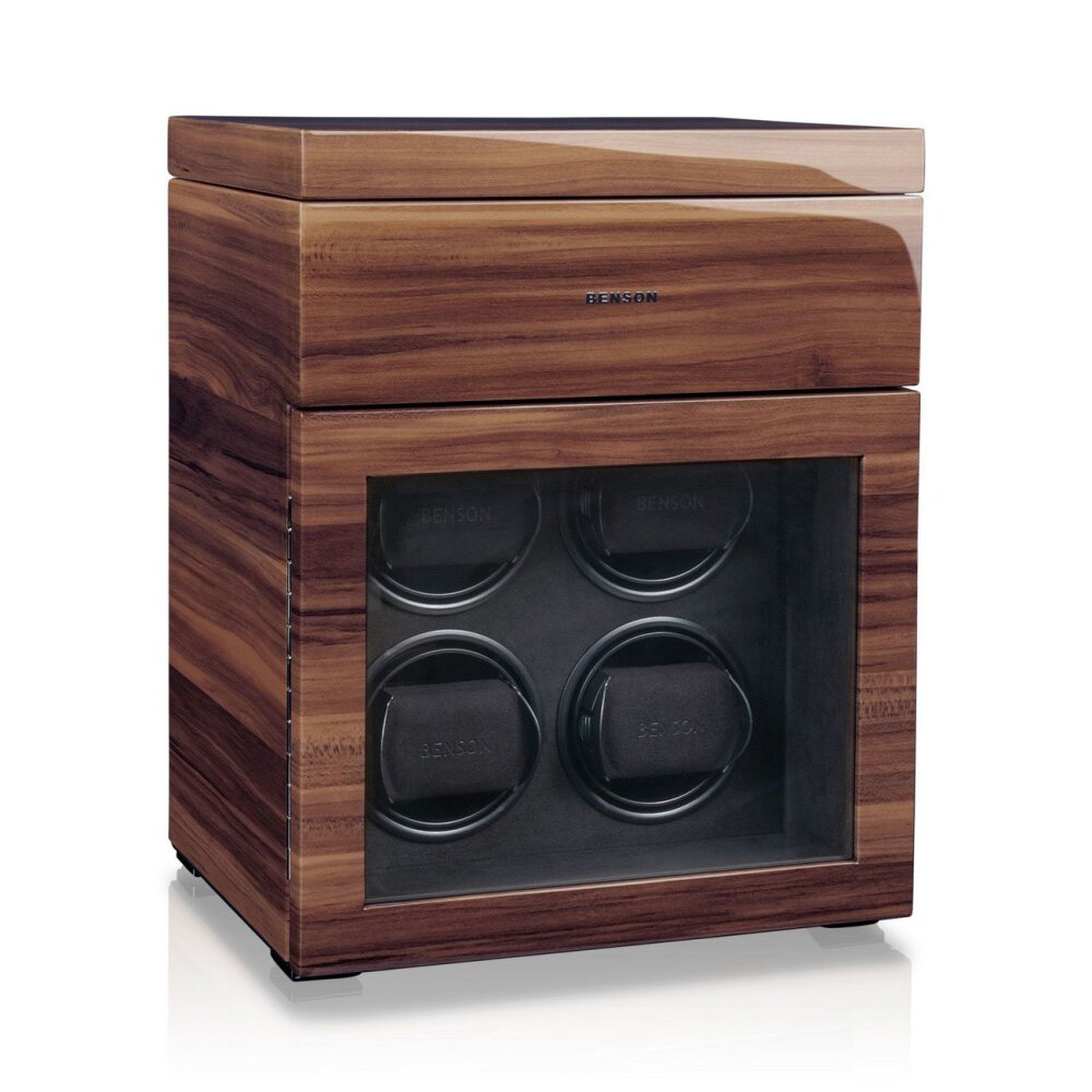 Механизм: Шкатулка с приводом (watch winders) прямоугольной формы, для хранения и поддержания в рабочем состоянии наручных часов с автоподзаводом в количестве 4 штук. Шкатулка оснащена мощным двигателем с бесшумным ходом и достаточно длительным сроком эксплуатации. Завод механизма часов осуществляет двигатель, совершающий поочерёдное вращение по часовой стрелке, против часовой стрелки и вращение в двух направлениях со скоростью 600; 900; 1200; 1500; 1800; 2100 оборотов в день. На жидкокристаллическом дисплее, созданном по эксклюзивной технологии, отражена функция контроля работы двигателя. Энергия для двигателя и жидкокристаллического дисплея поступает от сети переменного тока через входящий в комплект адаптер.