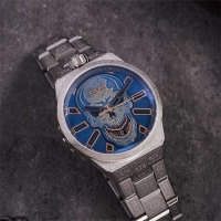 Корпус: Круглый корпус из нержавеющей стали марки 316L украшен замысловатой гравировкой Древа Жизни, символизирующей гармонию и связь. Синий циферблат, эргономичная завинчивающаяся заводная головка на 12 часах. На циферблате изображен уникальный рельефный череп. Фотолюминесцентное покрытие Super-Luminova® на глазах и зубах, а также на индексах и стрелках добавляет остроты, обеспечивая при этом идеальную читаемость даже в самых темных условиях. Сапфировое стекло с антибликовым покрытием. Диаметр корпуса 43 мм, толщина - 14,2 мм. Задняя крышка с прозрачным стеклом. Водостойкость 100 метров.