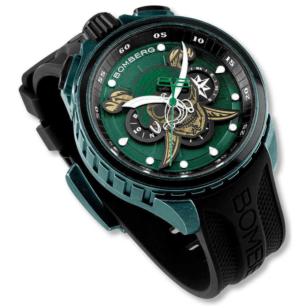 Корпус: Круглый стальной корпус марки 316L, с PVD покрытием синего цвета. Зелёный циферблат, часовые индексы и стрелки из белой латуни с люминесцентным покрытием (Super-LumiNova). На циферблате изображен уникальный рельефный череп. Сапфировое стекло с антибликовым покрытием.