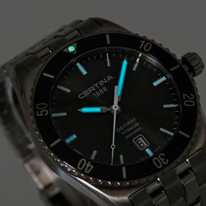 Корпус: Корпус из полированного/матового титана. Безель с 60 - минутной шкалой на керамическом чёрном кольце. Серый циферблат. Стрелки и часовые индексы золотистого цвета. Сапфировое стекло с антибликовым покрытием. Диаметр 41 мм. Водостойкость 200 м. Система DS.