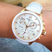 Корпус: Корпус из нержавеющей полированной стали с PVD покрытием розового золота и рельефным керамическим безелем. Белый перламутровый циферблат с золотистыми стрелками и рисками, один бриллиант на месте условного часового индекса (10 часов). Сапфировое стекло с антибликовым покрытием. Диаметр 38 мм. Водостойкость 100 м.