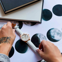 Функции: Индикация часов, минут при помощи центральных стрелок. Маленькая, отдельно вынесенная секундная стрелка. Дата в положении "4 часа". Индикация фазы луны в положении "10 часов". Хронограф.