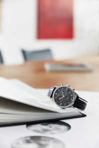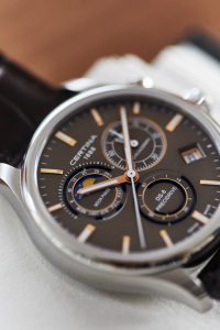 Функции: Индикация часов, минут при помощи центральных стрелок. Хронограф с 12-ти часовым, 60-ти секундным и 30-ти минутным счетчиками, индикация фазы луны и лунного цикла, индикация даты на "4" часа, вынесенная секундная стрелка на "6" часов.