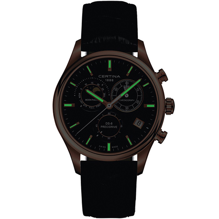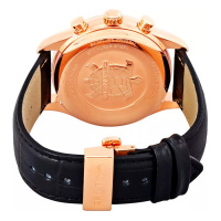 Функции: Индикация часов, минут при помощи центральных стрелок. Хронограф с 12-ти часовым, 60-ти секундным и 30-ти минутным счетчиками, индикация фазы луны и лунного цикла, индикация даты на "4" часа, вынесенная секундная стрелка на "6" часов.