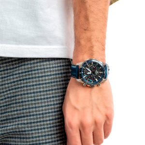 Функции: Центральные часовая и минутная стрелки, секундная стрелка вынесена на малый циферблат. Апертура даты в позиции 4 часов. Секундомер. Индикатор низкого заряда батареи.