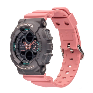 Корпус: Противоударный корпус из полимерного материала защищает механизм от ударов и вибрации. Часы защищены от магнитных полей. Модель отличает двуцветная расцветка, а именно черный полимерный корпус с контрастными стрелками и розовый ремешок. Высококонтрастный электронный ЖК-циферблат защищен минеральным стеклом. Циферблат подсвечивается светодиодом, функция автоподсветки освещает циферблат при повороте часов к лицу. Цвет подсветки оранжевый. Размер 45,4 мм x 49,0 мм х 15,8 мм. Водозащита 200 метров.