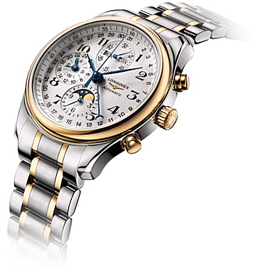 Функции: Индикация часов, минут при помощи центральных стрелок. Маленькая, отдельно вынесенная секундная стрелка. 30-ти минутный и 12-ти часовой счетчики хронографа, месяц, день недели, дата, фазы луны, дублирование времени в 24-часовом режиме в отдельном регистре.