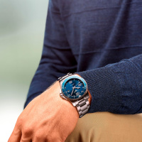 Корпус: Корпус выполнен из высококачественной стали 316L. Однонаправленный безель вращается со щелчками только в направлении против хода стрелок, боковая грань с ребристой насечкой, фронтальная поверхность из керамики синего цвета с контрастной разметкой, на отметке “12 часов” находится капсула со светящимся в темноте фотолюминесцентным элементом. Синий циферблат с узором sunray. Посеребренные полированные стрелки с покрытием Super-LumiNova®. Устойчивое к царапинам сапфировое стекло с многослойным антибликовым покрытием с обеих сторон. Диаметр 41 мм. Водонепроницаемость 300 метров, завинчивающаяся заводная коронка.