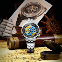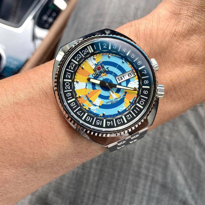 Функции: Центральные часовая, минутная и секундная стрелки. Апертура даты и дня недели в позиции 3 часов. Внутренний безель с 24х часовой шкалой. Разноцветный циферблат отражает землю как небесное тело во Вселенной, На ней изображена мистическая сияющая земля, которая отдает дань глубине и красоте природы, моря и леса.