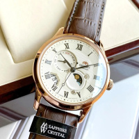Корпус: Корпус из высококачественного стального сплава с высокими антикоррозийными свойствами и IP покрытием. Циферблат цвета слоновой кости украшен рельефным декоративным узором. Узкие листовидные стрелки в стиле Feuille. Метки в виде римских цифр. Сапфировое стекло устойчивое к царапинам. Завинчивающаяся прозрачная задняя крышка. Диаметр корпуса: 42,5 мм. Толщина: 14 мм. Водонепроницаемость: 50 м.