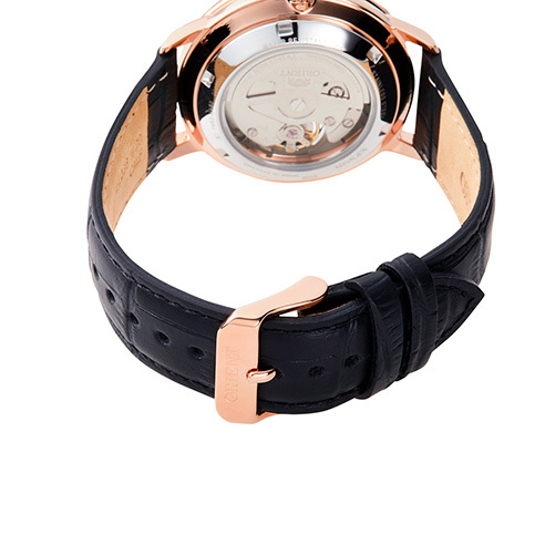 Корпус: Нержавеющая сталь с PVD покрытием цвета розового золота. Сапфировое стекло устойчивое к царапинам. Черный циферблат двухслойный, что придает ему объемный вид и привлекает внимание к движению часовой и минутной стрелок. Прозрачная винтовая задняя крышка. Водозащита - 100 метров. Диаметр 40 мм.