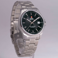 Корпус: Корпус выполнен из нержавеющей стали. Чёрный циферблат. Стрелки и часовые индексы из полированного металла. Сапфировое стекло. Водонепроницаемость 100 метров. Диаметр 39 мм.