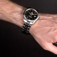 Корпус: Корпус выполнен из нержавеющей стали. Чёрный циферблат. Стрелки и часовые индексы из полированного металла. Минеральное стекло с сапфировым покрытием. Водонепроницаемость 50 метров. Диаметр 40 мм.