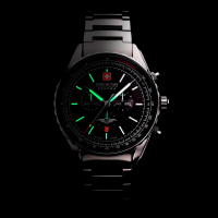 Корпус: Корпус выполнен из нержавеющей стали. Чёрный циферблат. Стрелки и метки с люминесцентным покрытием, которое светится в темноте после непродолжительной зарядки на свету. Рифленая заводная головка украшена фирменным логотипом. . Сапфировое стекло, особо устойчивое к царапинам. Диаметр корпуса составляет 44 мм. Водостойкость WR 100.