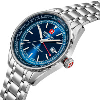 Корпус: Круглый корпус выполнен из нержавеющей стали 316. Рифленый безель. Циферблат синего цвета выполнен по технологии Sunray (солнечные лучи) и защищен прочным сапфировым стеклом. По краю циферблата нанесена минутная шкала и названия мировых городов для отслеживания времени в других часовых поясах. Стрелки и метки с люминесцентным покрытием, которое светится в темноте после непродолжительной зарядки на свету. Рифленая заводная головка украшена фирменным логотипом. Диаметр 44 мм. Водонепроницаемость 100 м.