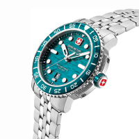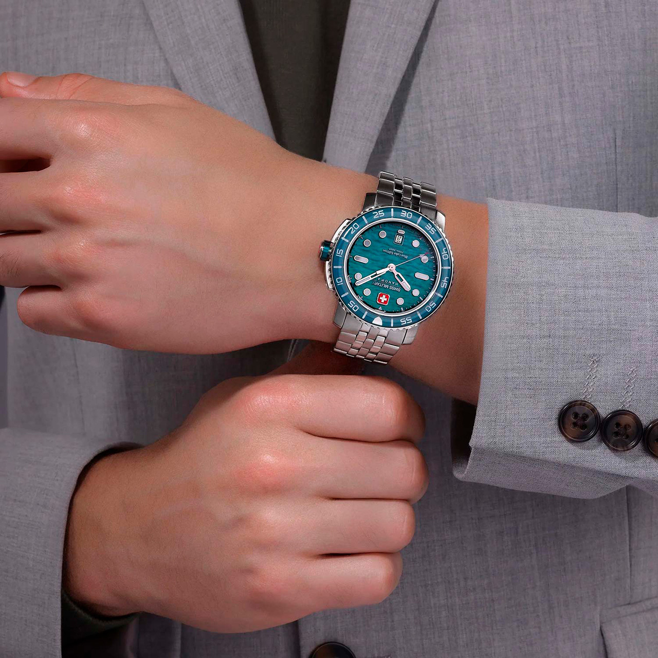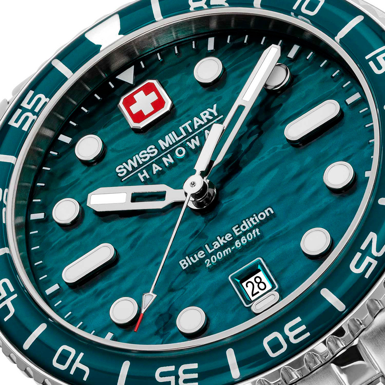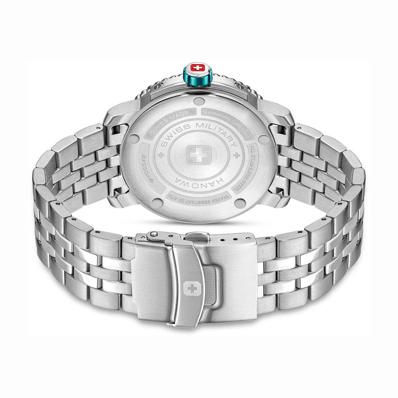 Корпус: Круглый стальной корпус. Вращающийся в одном направлении рифленый безель с минутной шкалой. Циферблат с лаковым покрытием и эффектом потертости дополнен фирменным логотипом Swiss Military Hanowa в положении 12 часов и защищен устойчивым к царапинам сапфировым стеклом. Метки в виде точек и штрихов и стрелки с люминесцентным покрытием, которое светится в темноте после непродолжительной зарядки на свету. Завинчивающаяся заводная головка с защитой украшена фирменным логотипом. Диаметр 44 мм. Водозащита 200 м.