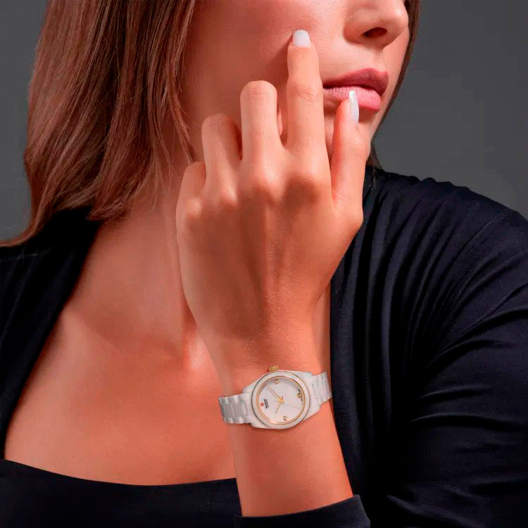 Корпус: Круглый корпус из керамики белого цвета, вставки из стали с IP покрытием. Белый перламутровый циферблат, украшен тремя искусственными бриллиантами. Позолоченные стрелки с люминесцентным покрытием, которое светится в темноте после непродолжительной зарядки на свету. Сапфировое стекло устойчивое к появлению царапин, обладающее высокой прозрачностью. Диаметр: 31,5 мм. Водонепроницаемость: 50 м.