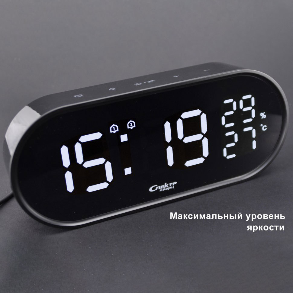Механизм: Часы настольные с цифровой индикацией с будильником и измерением температуры и влажности. Яркость свечения часов можно плавно регулировать с помощью специального колёсика управления. Часы показывают время, температуру (можно выбрать градусы Цельсия или Фаренгейта) и влажность (%). Две центральные точки на дисплее часов не мигают. У данной модели часов сенсорные кнопки управления. Часы могут работать, в том числе, только от батареек, т.е. без подключения к внешнему источнику питания. Когда часы работают только от батареек, дисплей всё время выключен, при этом касание любой кнопки включит индикацию примерно на 10 секунд. У часов можно выставить два времени будильника. Будильник имеет нарастающую громкость сигнала и функцию повтора сигнала (snooze). Время, через которое сигнал сработает повторно, можно установить в диапазоне 5 – 30 минут, с шагом в 5 минут. Или установить равным 0, т.е. отключить функцию повтора сигнала. Питание осуществляется от порта USB. В комплекте с часами идёт USB шнур (1,5 метра) для питания часов от USB источника (5V). Для питания можно использовать, например, любой адаптер, предназначенный для зарядки мобильных телефонов, и имеющий USB выход. Блока питания от сети 220V в комплекте нет.