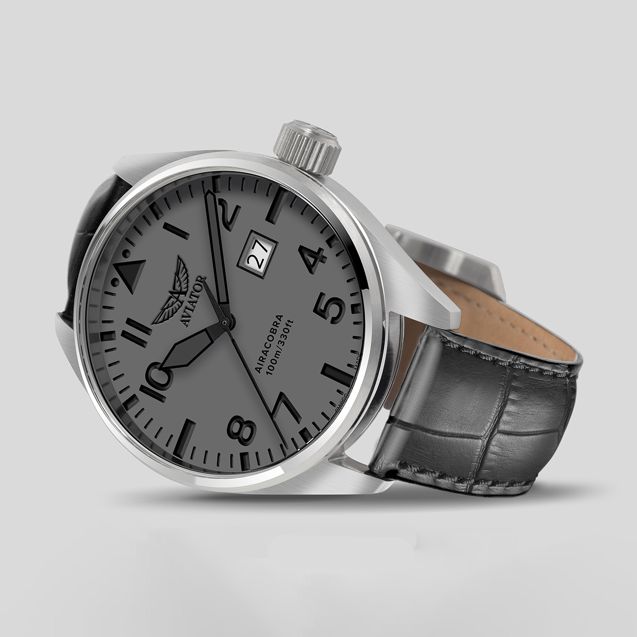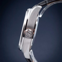 Ремешок: Серый ремешок из телячьей кожи с тиснением под аллигатора, ширина 20/18 мм, классическая застежка – пряжка из нержавеющей стали.