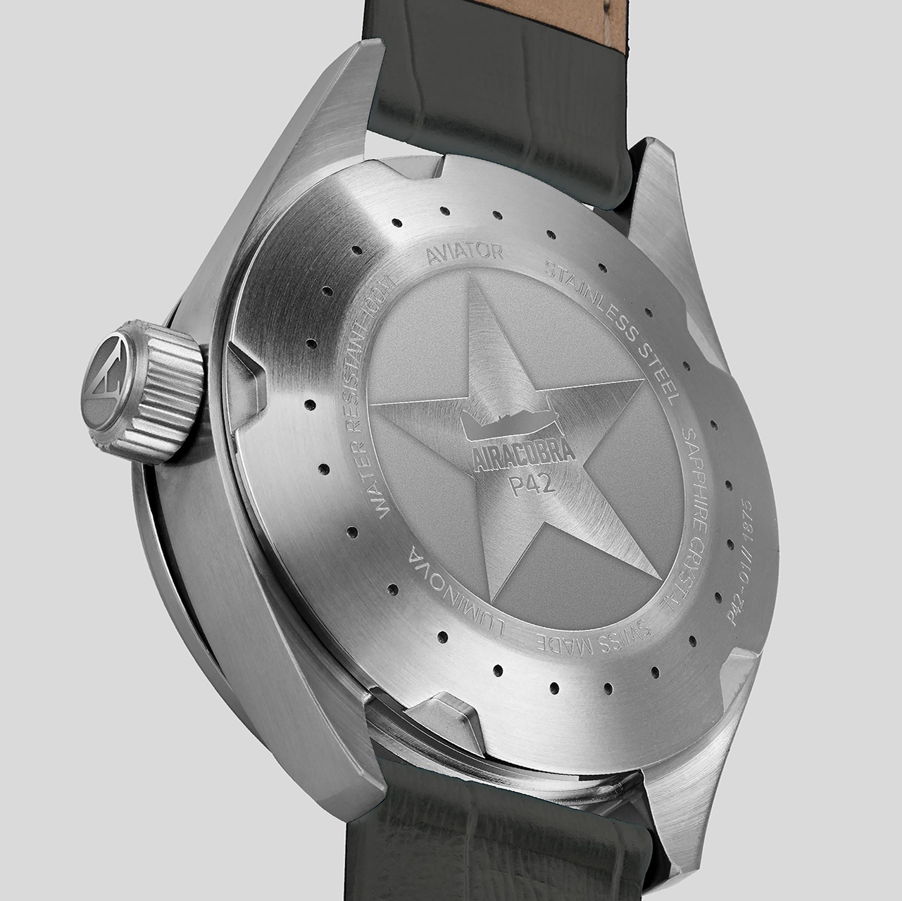 Корпус: Нержавеющая сталь. Циферблат серый, стрелки и часовые индексы с люминесцентным покрытием. Своей матовой зернистой отделкой циферблат часов напоминает приборы из кабины пилота. Лаконичные, высококонтрастные стрелки и часовые метки обеспечивают превосходную четкость и читаемость изображения. Диаметр 42 мм. Сапфировое стекло с антибликовым покрытием. Задняя крышка имеет резьбовое соединение с корпусом. Переводная коронка с двойным уплотнителем и винтовой фиксацией для дополнительной защиты от попадания воды. Водозащита 100 метров. На крышке изображение самого самолета и военная звезда как дань почтения истребителю времен Второй мировой войны.