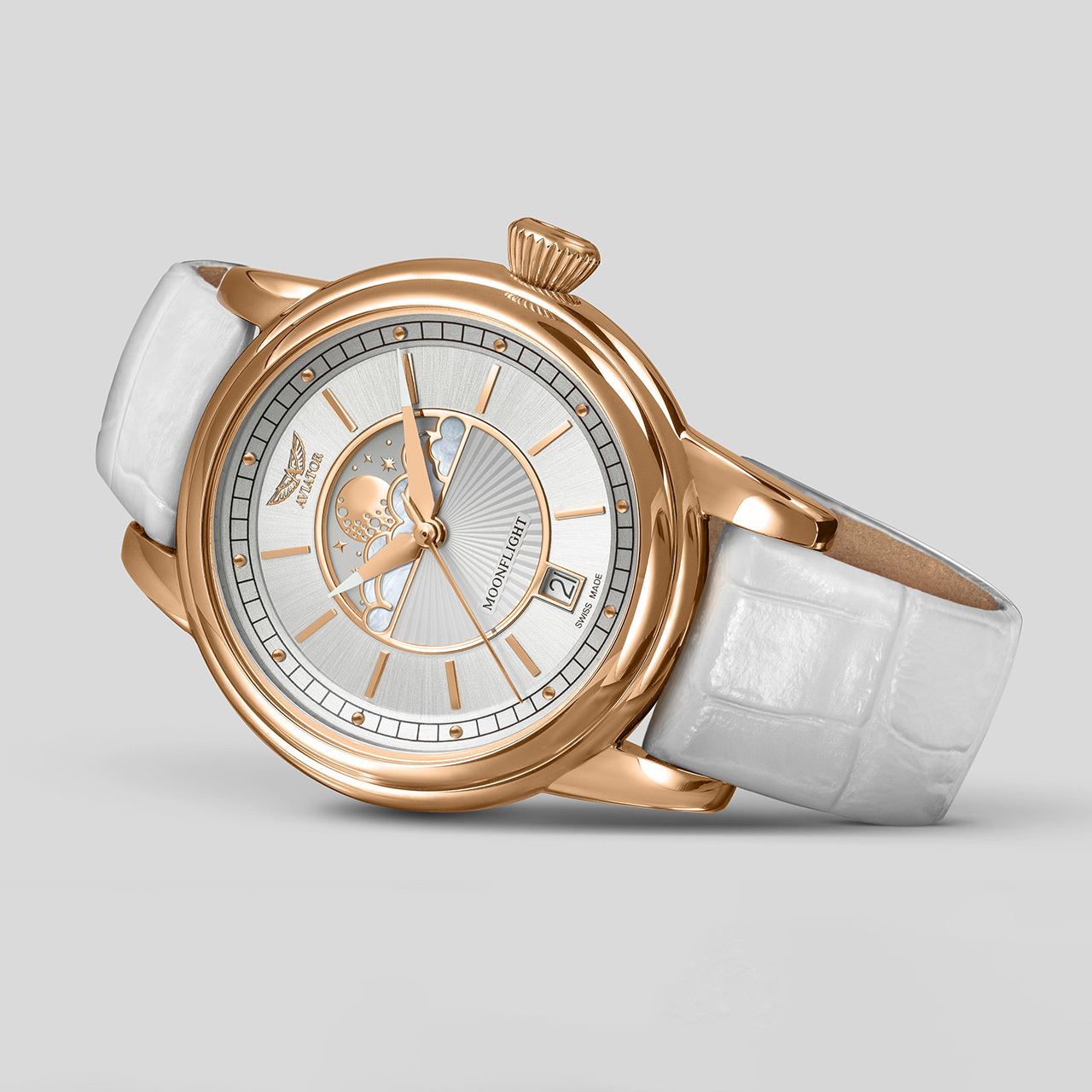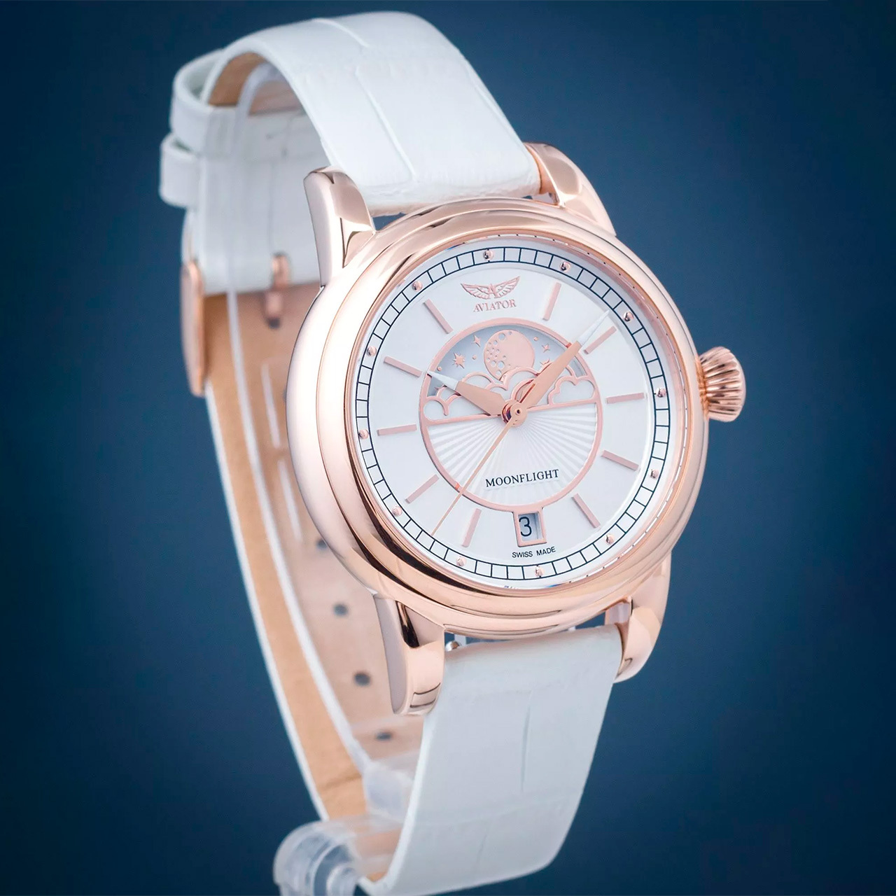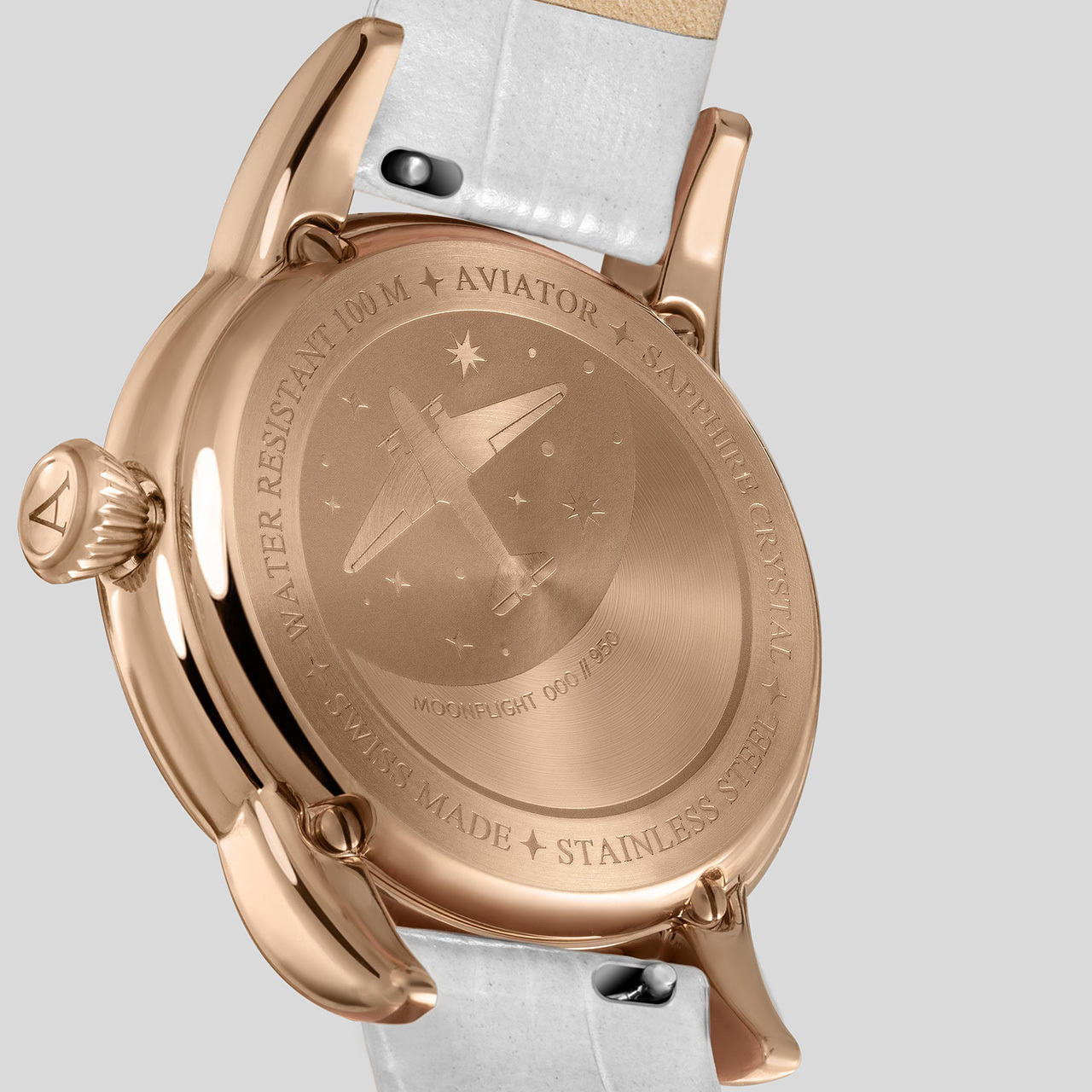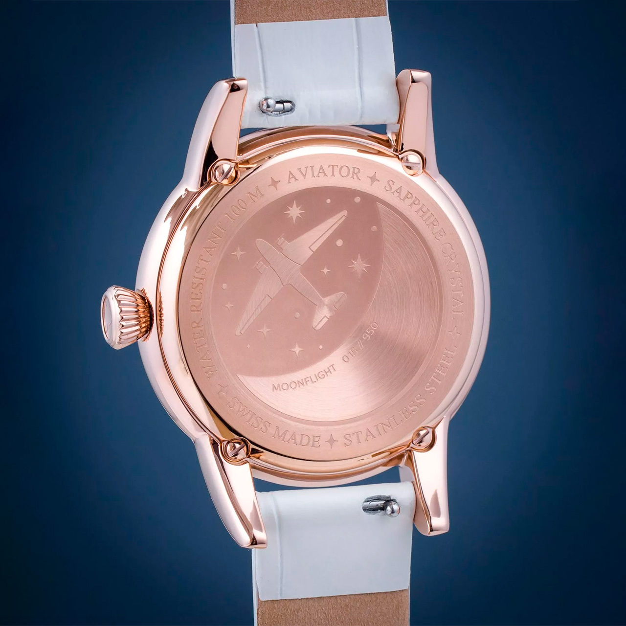 Корпус: Нержавеющая сталь марки 316L с розовым PVD покрытием. Светлый циферблат. Стрелки и часовые индексы золотистого цвета покрыты люминесцентным составом SuperLuminova. Облака на циферблате украшены перламутровыми вставками. Задняя крышка с гравированным изображением авиалайнера Douglas DC-3 имеет винтовое соединение с корпусом. Рифлёная заводная головка. Сапфировое стекло с антибликовым покрытием. Водонепроницаемость 100 метров. Диаметр 36 мм.