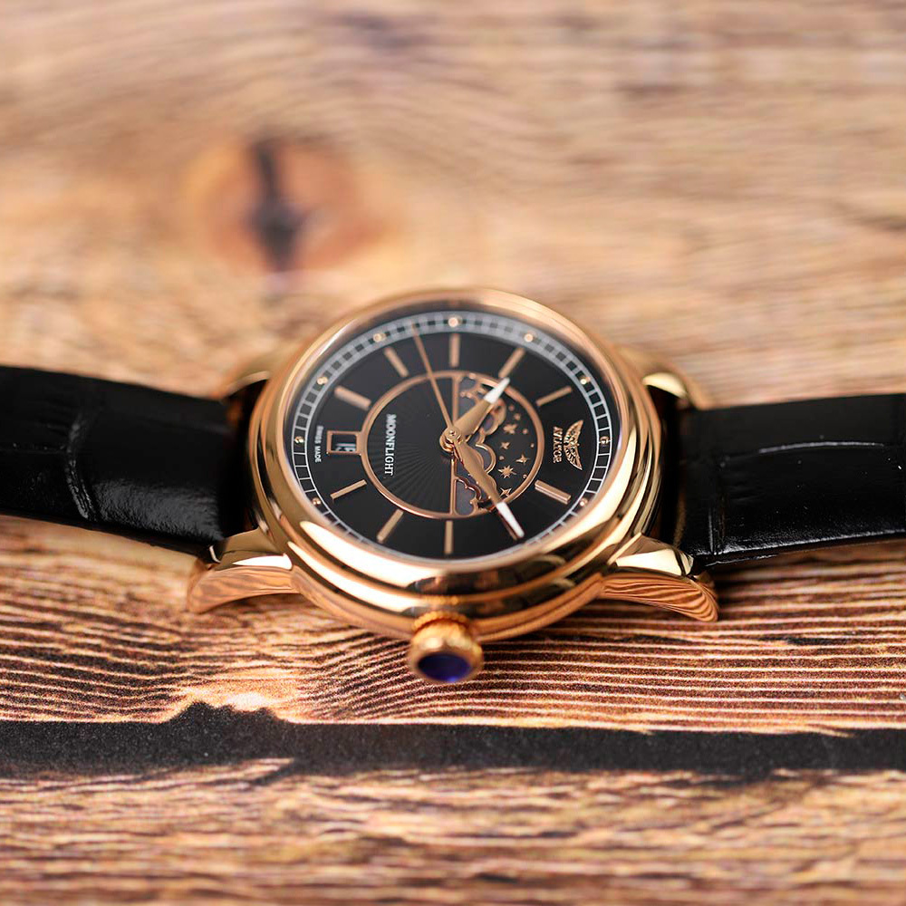 Функции: Индикация часов, минут и секунд при помощи центральных стрелок. Дата. Фазы Луны.