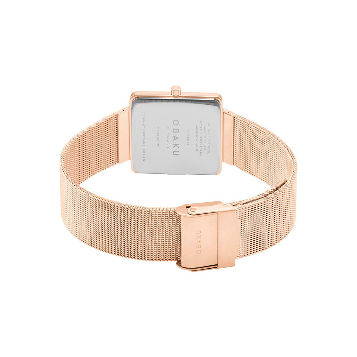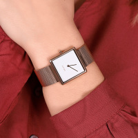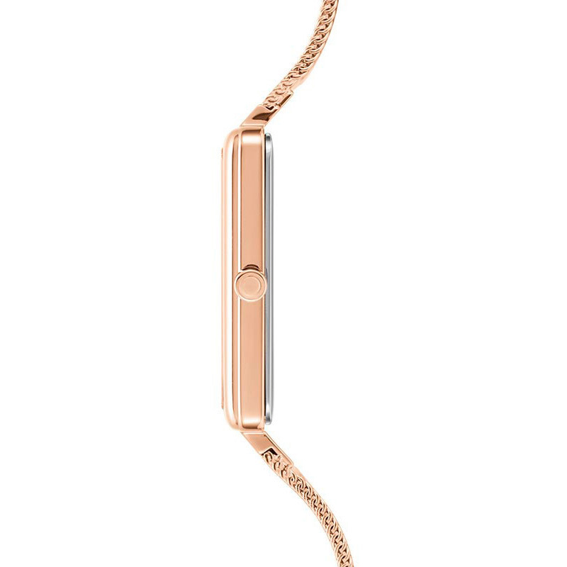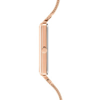 Корпус: Квадратный корпус выполнен из матовой нержавеющей стали с IP покрытием цвета розового золота. Белый циферблат. Метки в виде штрихов. Прямоугольные стрелки. Устойчивое к возникновению царапин сапфировое стекло. Размер корпуса составляет 28х28 мм. Толщина - 4,9 мм. Водостойкость WR 30 (брызги).