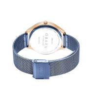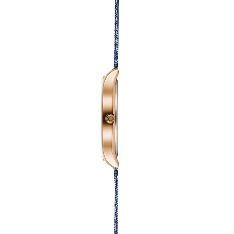 Корпус: Круглый корпус выполнен из нержавеющей стали с IP покрытием цвета розового золота. Синий циферблат. Метки в виде штрихов. Минеральное стекло. Диаметр корпуса составляет 35 мм. Водостойкость WR 30 (брызги).
