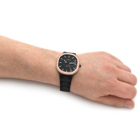 Корпус: Восьмиугольный корпус выполнен из нержавеющей стали с IP покрытием цвета розового золота. Чёрный циферблат. Минеральное стекло устойчивое к мелким механическим повреждениям. Водозащита 50 м. Диаметр 42 мм.