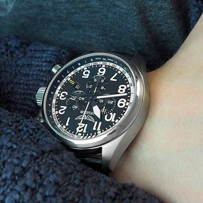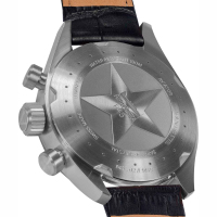 Корпус: Корпус изготовлен из нержавеющей стали 316L, устойчивой к коррозии, отличающейся высокой прочностью и устойчивостью к царапинам. Матовый циферблат с зернистой отделкой имеет окраску черного цвета. Дополнительные индикаторы с рельефом в виде тонких концентрических линий. Контрастные часовые метки и цифры в стиле “пилот” выполнены методом печати. Яркие акценты и окраска вспомогательных стрелок желтым цветом обращается к оформлению приборной панели «Аэрокобры». Стрелки и метки на циферблате имеют люминесцентное покрытие позволяющее легко определять время даже в темноте. Сапфировое стекло с антибликовым покрытием защищает циферблат от царапин и обеспечивает отличную читаемость при любом освещении. Переводная коронка с двойным уплотнителем и винтовой фиксацией для дополнительной защиты от попадания воды внутрь корпуса. Переводная коронка увеличенного размера для удобства вращения рукой в летной перчатке с гравировкой в виде буквы «A» - заглавной в названии марки. Задняя крышка имеет резьбовое соединение с корпусом. В оформлении задней крышки использована стилизация под элементы дизайна самолетов Airacobra. Диаметр часов: 45 мм. Водозащита до 10 ATM (100 метров) делает часы подходящими для плавания.