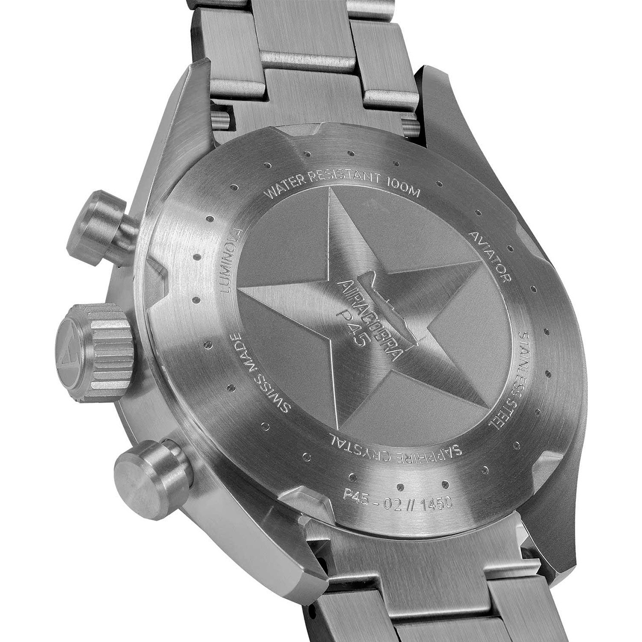 Корпус: Корпус выполнен из нержавеющей высоколегированной стали 316L с матовой обработкой. Циферблат часов чёрного цвета напоминает приборную панель, а классический корпус добавляет винтажные ноты. Задняя крышка стилизирована под дизайн самолета Airacobra. Стрелки и метки с покрытием SuperLuminova. Окраска вспомогательных стрелок желтым цветом обращаены к приборной панели «Аэрокобры». Сапфировое стекло с антибликовым покрытием. Диаметр 45 мм. Водозащита 100 метров.