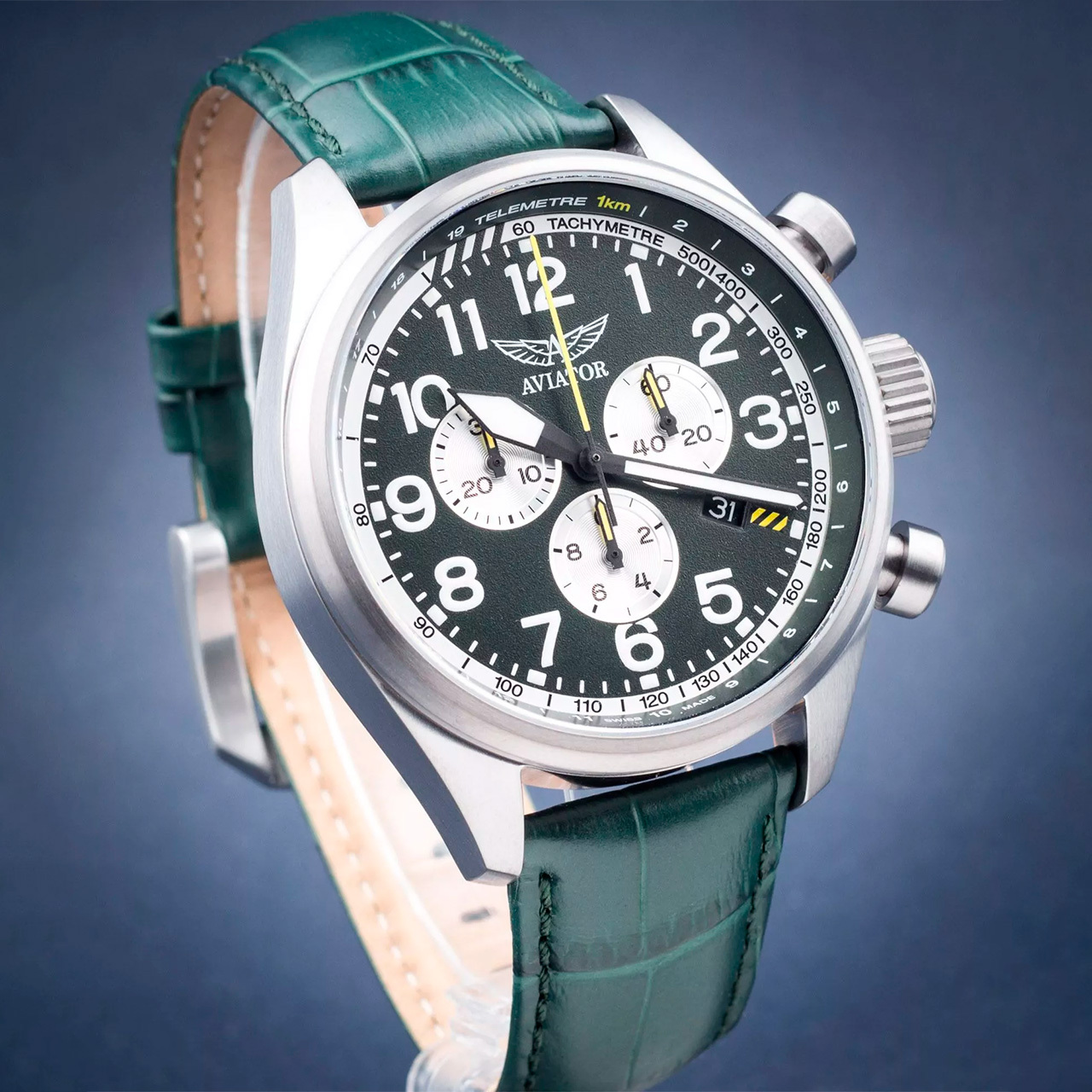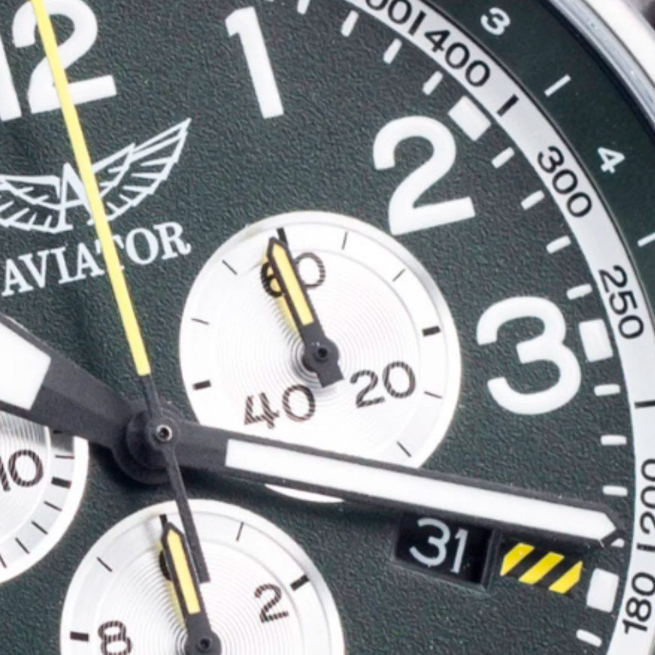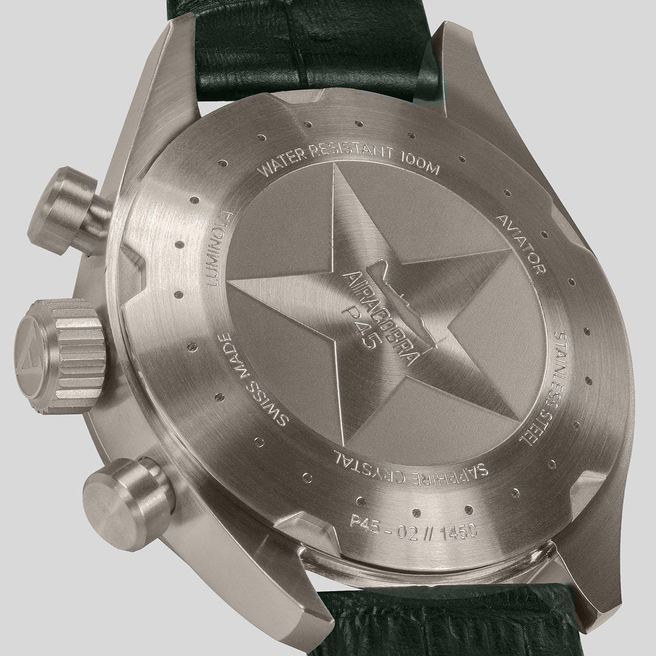 Корпус: Корпус модели выполнен из высококачественной стали с повышенной устойчивостью к коррозии марки 316L. Циферблат зелёного цвета, чёрные стрелки. Цифры в стиле “пилот” выполнены методом печати. Стрелки и метки с покрытием SuperLuminova, отлично читаются в полнейшей темноте и в условиях слабой освещенности. Сапфировое стекло с антибликовым покрытием. Переводная коронка с двойным уплотнителем, винтовой фиксацией и увеличенного размера для удобства вращения рукой в летной перчатке с гравировкой в виде буквы «A». Диаметр 45 мм. Водозащита 100 метров.