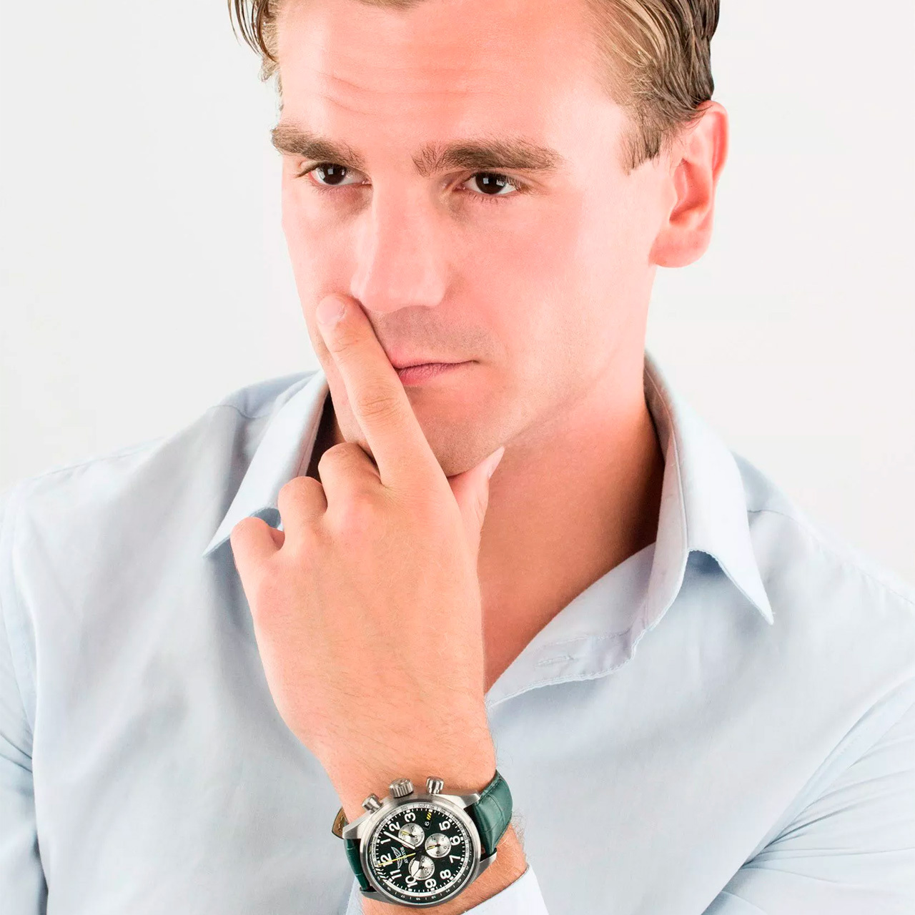 Ремешок: Зеленый ремешок из телячьей кожи с тиснением под аллигатора, ширина 22/20 мм, классическая застежка – пряжка из нержавеющей стали.
