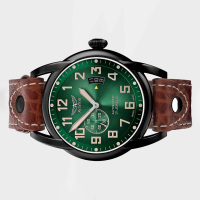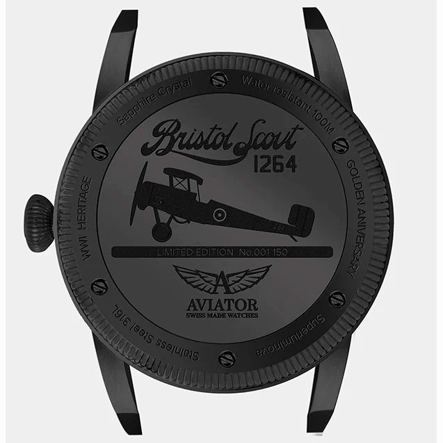 Корпус: Большой корпус в стиле карманных часов с необычными дужками выполнен из матовой нержавеющей стали марки 316L, с чёрным PVD покрытием. Циферблат, похожий на приборную панель самолета, зелёного цвета c цифрами, стрелками и индексами, покрытыми светонакопительным составом Super-Luminova. Сапфировое стекло с двусторонним антибликовым покрытием имеет повышенную устойчивость к возникновению царапин. Задняя крышка украшена гравировкой с изображением самолета и имеет винтовое соединение с корпусом. Диаметр 46 мм, толщина 12,8 мм. Водостойкость 100 метров (10 АТМ).