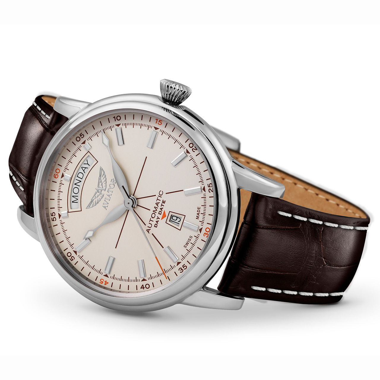 Функции: Центральные часовая, минутная и секундная стрелки, индикация даты и дня недели в апертуре на отметке “6 часов” и большой полукруглой апертуре вверху циферблата.