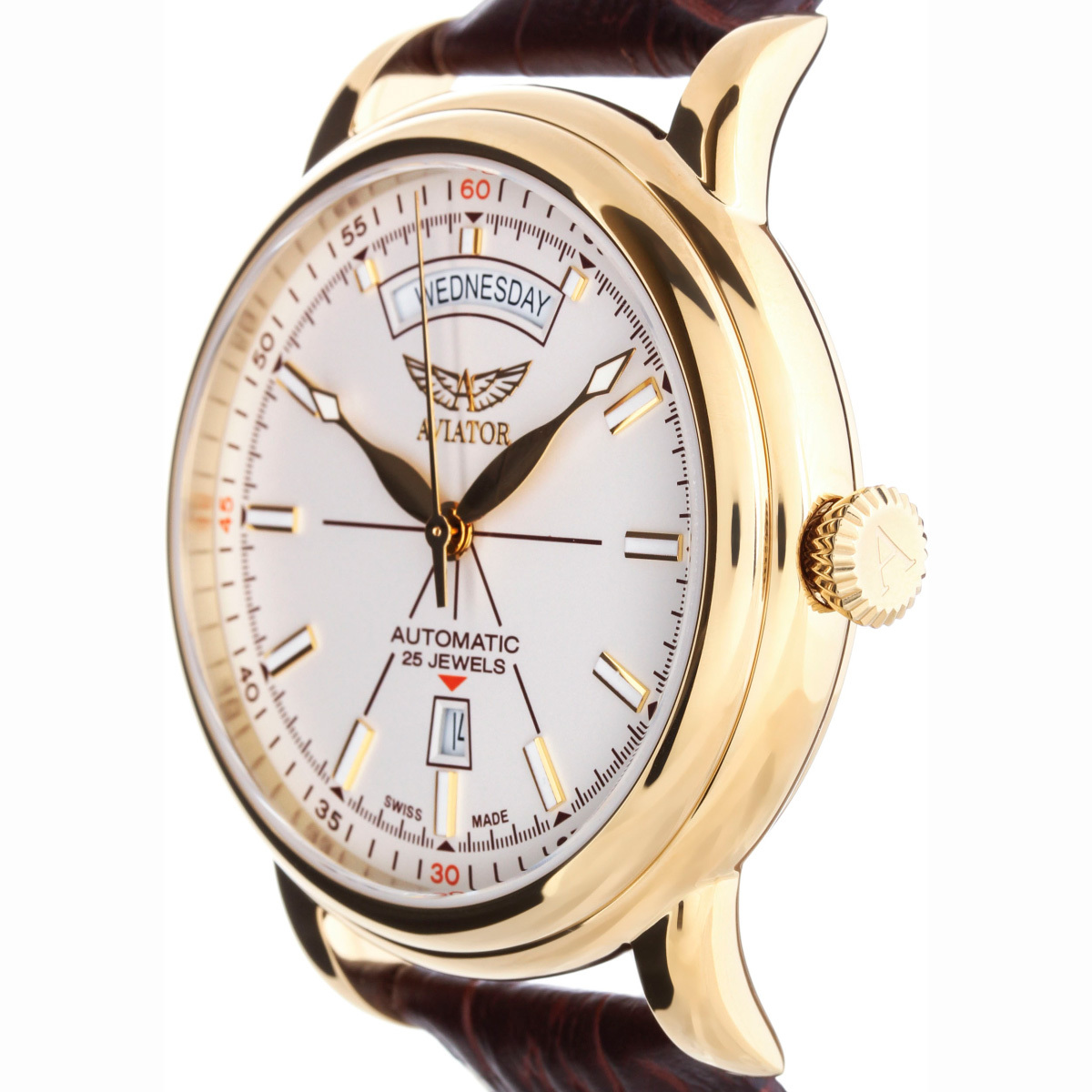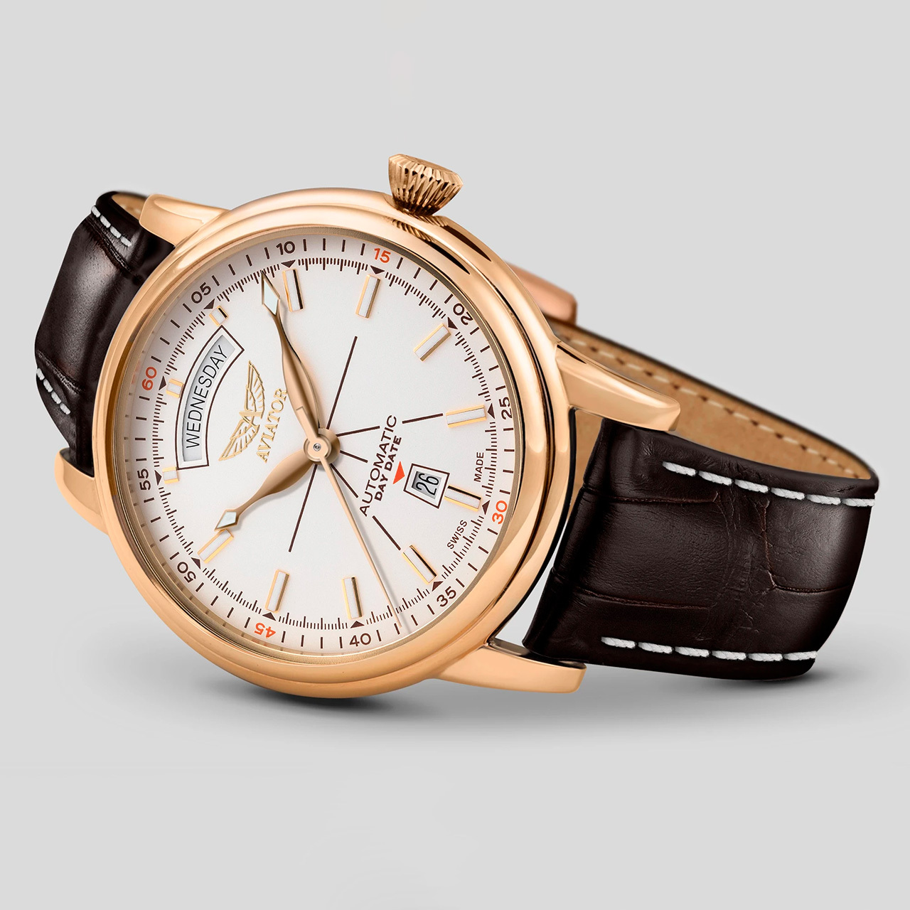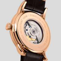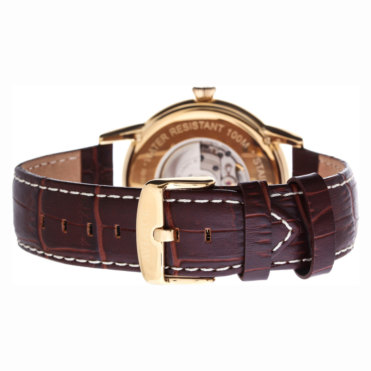 Ремешок: Коричневый ремешок из телячьей кожи с тиснением под аллигатора, контрастная прошивка по краю, ширина 22/20 мм. Браслетная застежка из нержавеющей стали, раскладывающаяся при нажатии кнопок двойной блокировки.