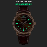 Функции: Центральные часовая, минутная и секундная стрелки, индикация даты и дня недели в апертуре на отметке “6 часов” и большой полукруглой апертуре вверху циферблата.