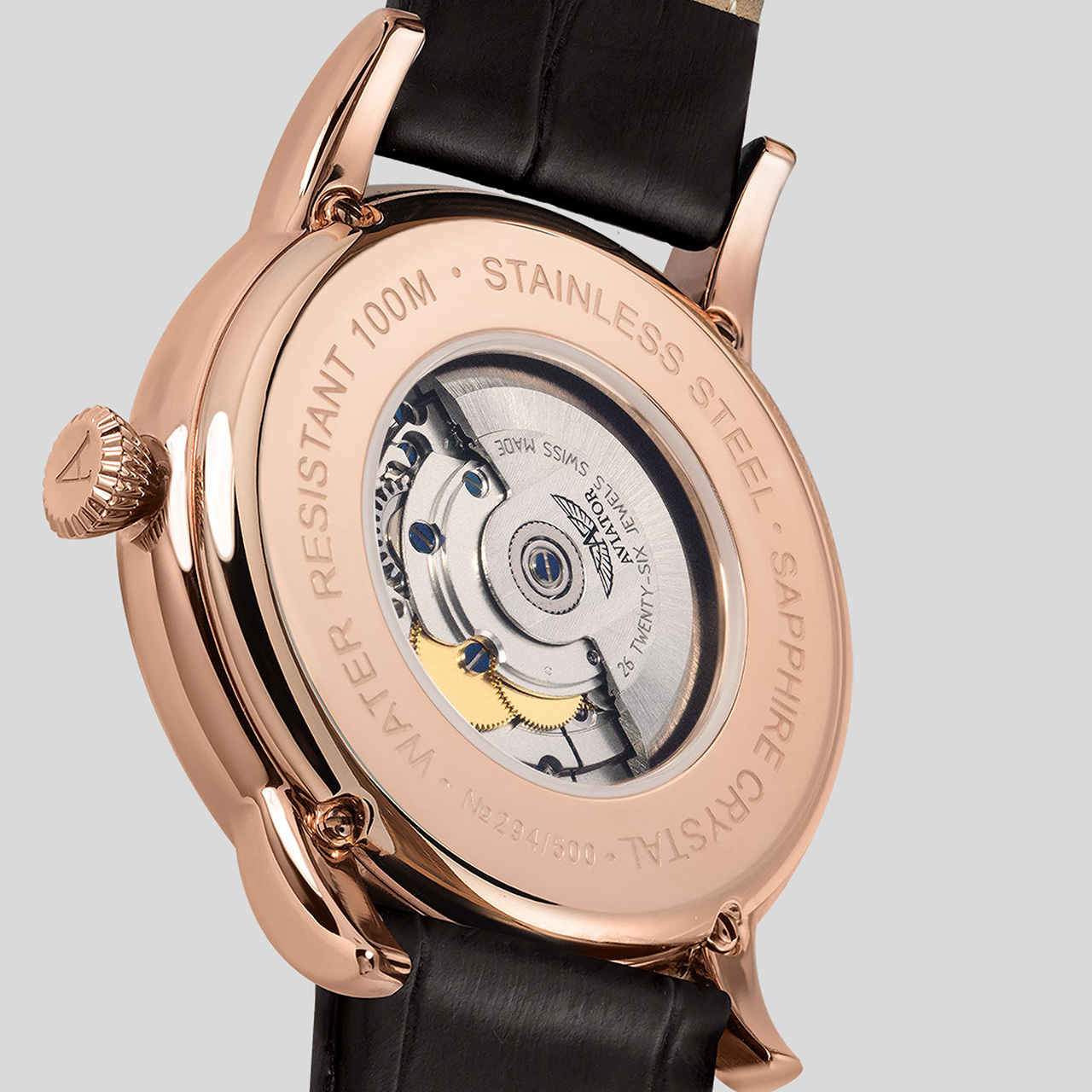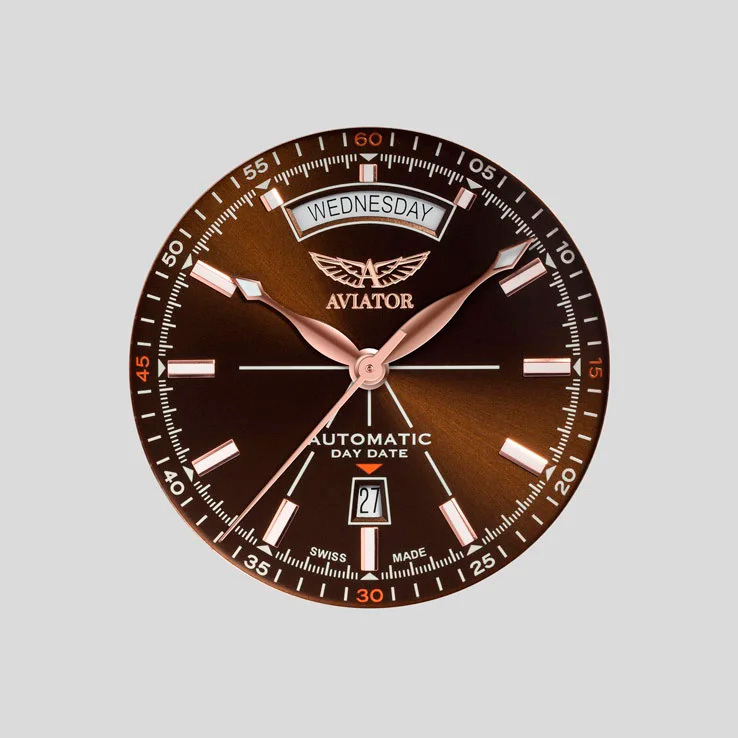 Корпус: Корпус круглой формы выполнен из нержавеющей стали марки 316L с PVD покрытием. Коричневый циферблат. Аппликация часовых индексов и печатная разметка в стиле авиационных приборов. Стрелки и часовые метки имеют светящееся в темноте люминесцентное покрытие SuperLuminova. Сапфировое стекло с двусторонним антибликовым покрытием имеет повышенную устойчивость к возникновению царапин. Переводная коронка с двойным уплотнителем для дополнительной защиты, задняя крышка с прозрачным окном имеет винтовое соединение с корпусом.Диаметр 45 мм. Водозащита 100 метров.