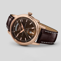 Ремешок: Коричневый ремешок из телячьей кожи с тиснением под аллигатора, контрастная прошивка. Браслетная застежка из нержавеющей стали с PVD покрытием, раскладывающаяся при нажатии кнопок двойной блокировки.