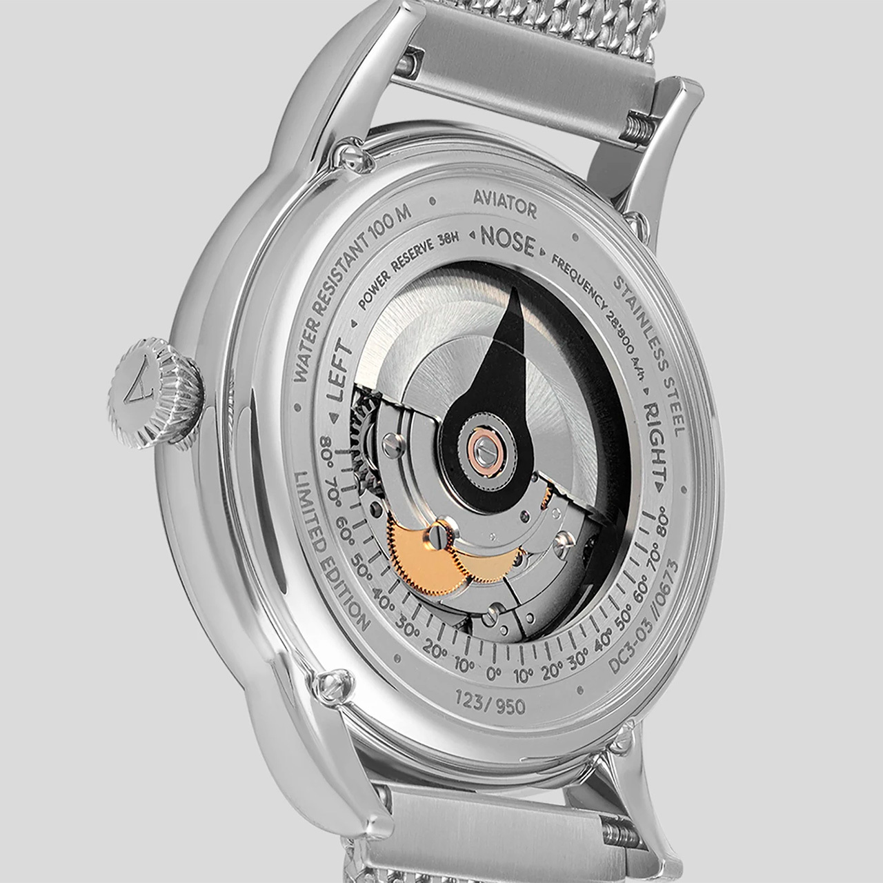 Корпус: Корпус круглой формы выполнен из нержавеющей стали марки 316L. Циферблат выполнен по технологии sun-ray (солнечные лучи). Часовые метки выполнены в виде штрихов. Стрелки и метки с покрытием SuperLuminova. Сапфировое стекло с двусторонним антибликовым покрытием. Прозрачная задняя крышка украшена имитацией функции контроля управления хвоста самолета. Ротор механизма указывает на градусы, как в авиационном приборе триммер. Диаметр 45 мм, толщина 11,5мм. Водозащита 100 метров.