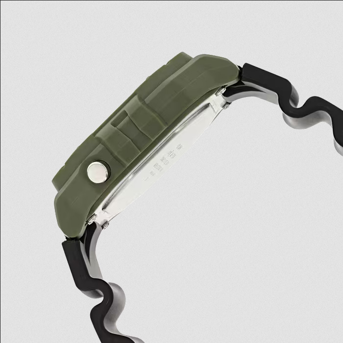 Корпус: Ударопрочный корпус часов сделан из высококачественного полимерного материала, зелёного цвета. Защищает циферблат акриловое (пластиковое) стекло. Размер корпуса (Д × Ш × В) 37,9 × 34,9 × 11,9 мм. Водонепроницаемость: 50 м.